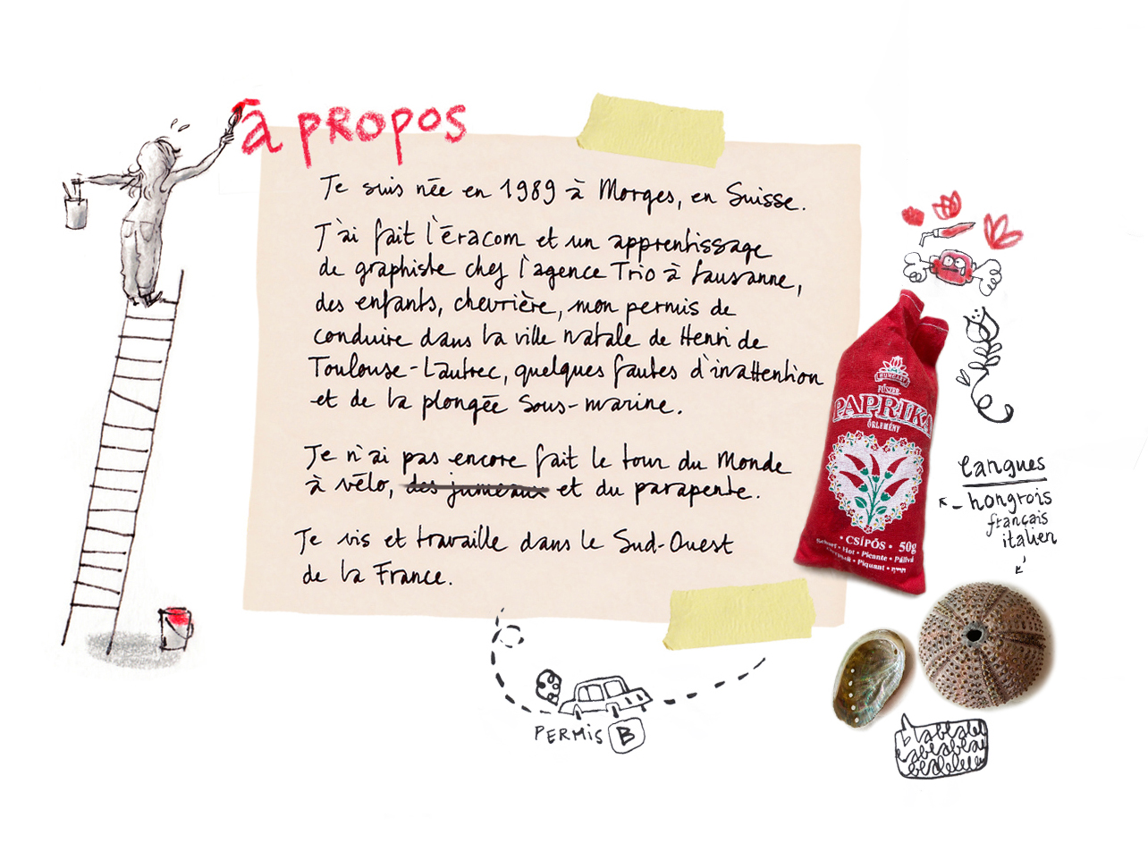 « Illustratrice, graphiste et scénographe de son métier, elle donne la vie aux acteurs de multiples projets en quelques coups de crayon ! Téléphone, ordi, agenda, carnet de voyage, lunette et surtout des crayons de toutes les couleurs sont les outils précieux et indispensables pour assurer la coordination à son travail aux multiples facettes. La création, les rencontres et surtout l’envie de partager sont au cœur de son métier. » (Extrait de Pain Soleil et itinérances de familles yézidies – raconte moi une expo) PETR Pays Midi-Quercy